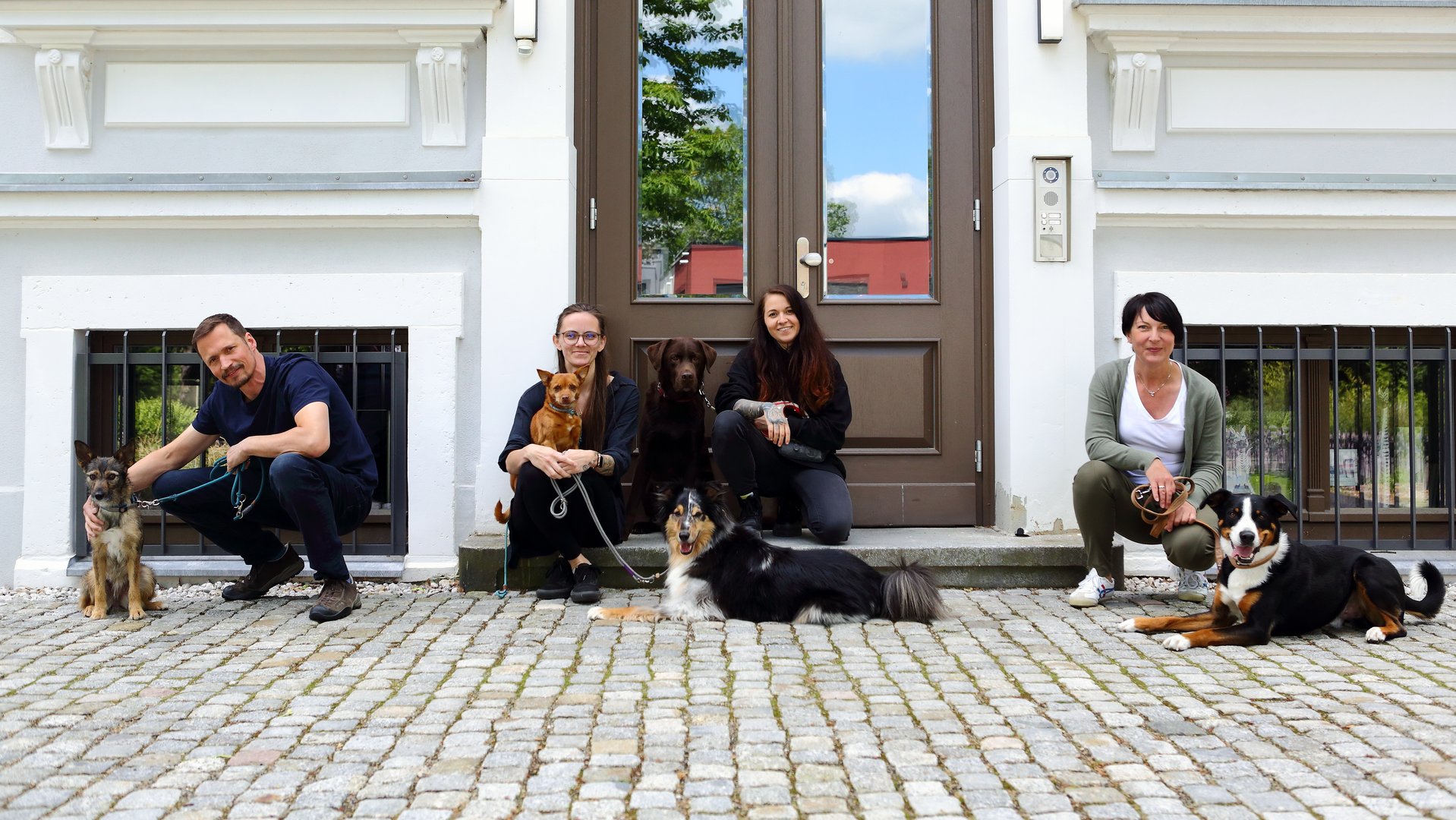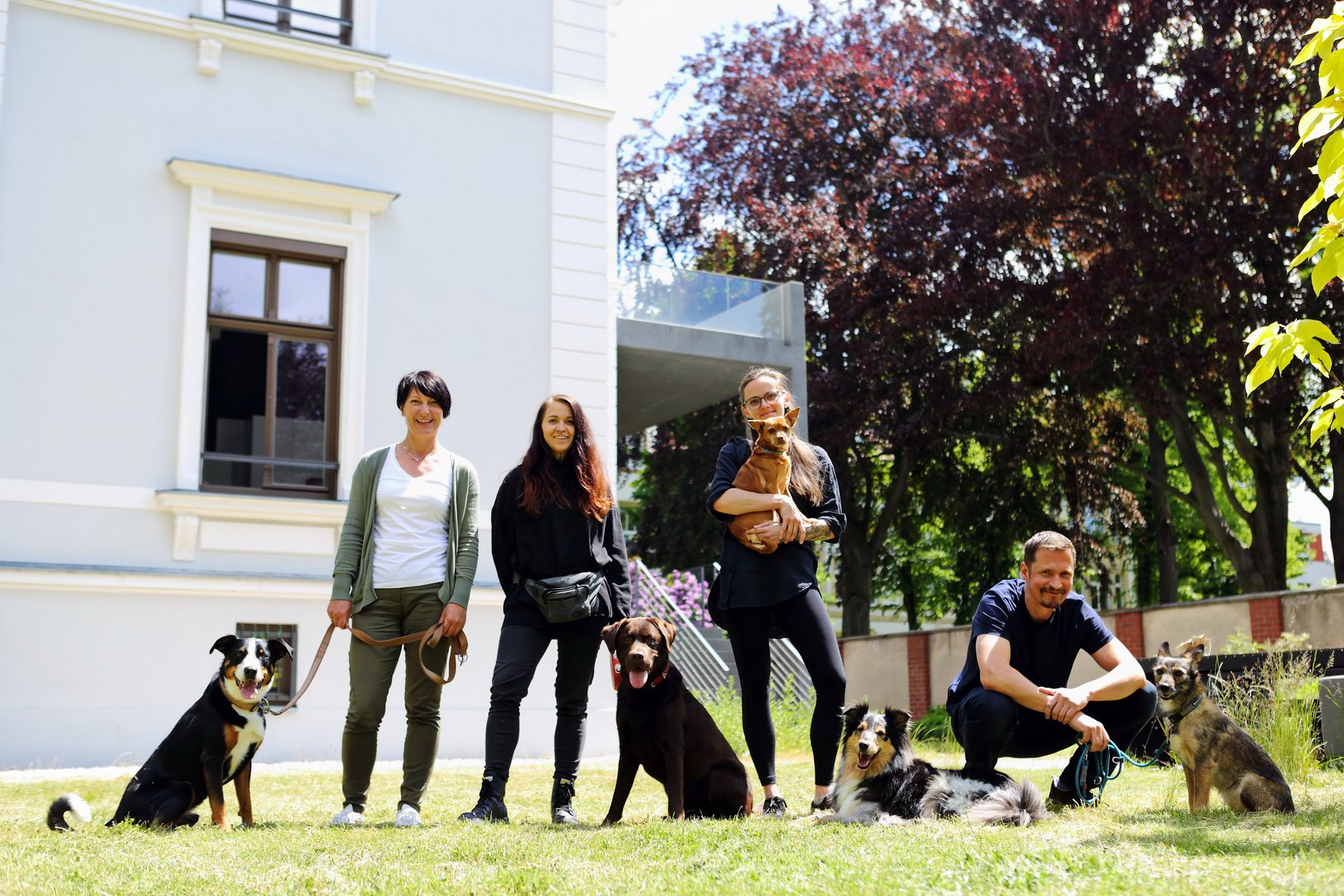 Ebenso wie die namensgebenden Zebras treten auch die Bürohunde von Chemnitz‘ größter Werbeagentur gern mal in der Herde – oder halt im Rudel – auf. Bis zu sieben Hunde kommen mehr oder minder regelmäßig mit in die Zebra-Villa auf dem Kaßberg. Fürs Foto konnten wir fünf vereinen: Appenzeller-Sennen-Hund Ben mit Halterin Elke Beier, Labrador Bmo von Susann Mauersberger sowie die zu Silke Scheithauer gehörenden Mischlinge Kasi und Skali sowie – ebenfalls eine Mixtour – Pebbles von Uwe Bläffert. .