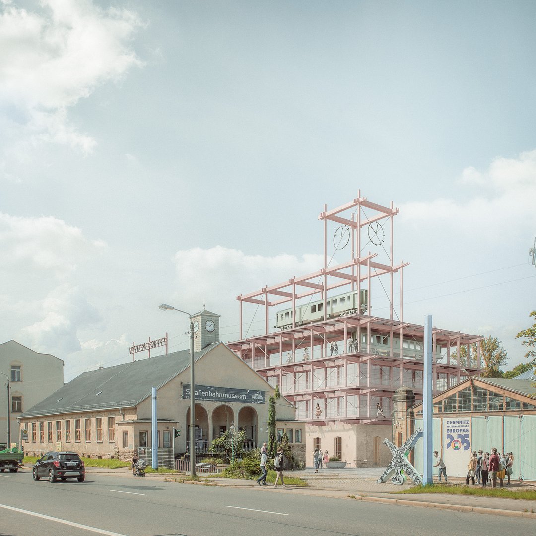 So soll der Garagen-Campus alles in einem werden: Museum und Showroom, offene Eventfläche und Abenteuerspielplatz, Werkstatt und Freizeitpark, Markthalle und Coworking-Space. Und dazu auch wieder Betriebshof der CVAG: Wenn der Chemnitzer Westen per Straßenbahn erschlossen wird, sollte es hier eine Abstellfläche für Trams geben. Bei so vielen unterschiedlichen Nutzungen braucht es identitätsstiftende Landmarks. Zwei hat das Architekturbüro FRIDA-Architekten im Auftrag der Arbeitsgruppe entwickelt – und beide könnten ihren Zweck erfüllen: „Vertical Kappel“ ist eine hohe Holzkonstruktion, die den Eingangsbereich des Garagen-Campus markiert und mit einem weit oben platzierten Straßenbahn-Waggon krönt. Nicht minder spektakulär und zusätzlich noch funktional präsentiert sich die zweite Architekturversion „The Bridge“: Sie verknüpft über mehrere Etagen den hinteren Teil des Areals mit seiner stadträumlichen Umgebung, mit Straßenbahnstrecke und Kleingärten. Auf mehreren Ebenen könnten hier in einer Aquaponik-Anlage Lebensmittel angebaut werden.
